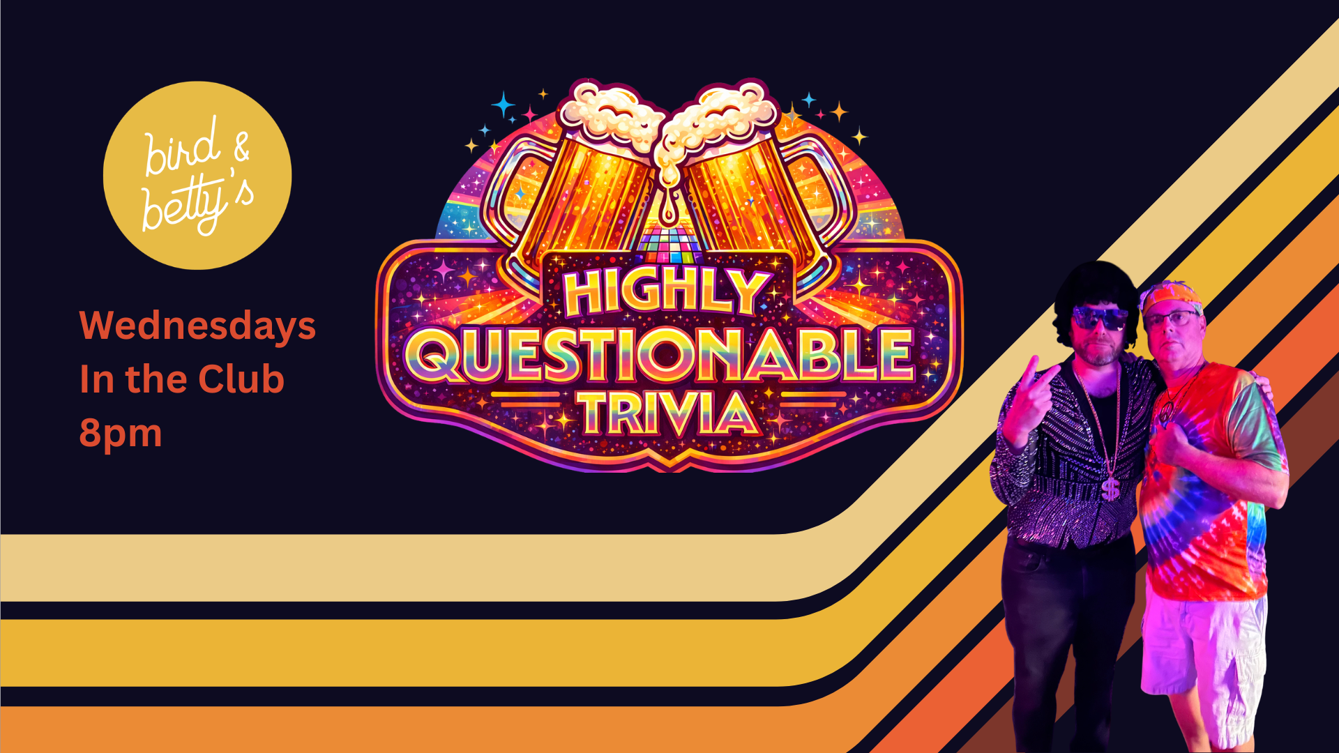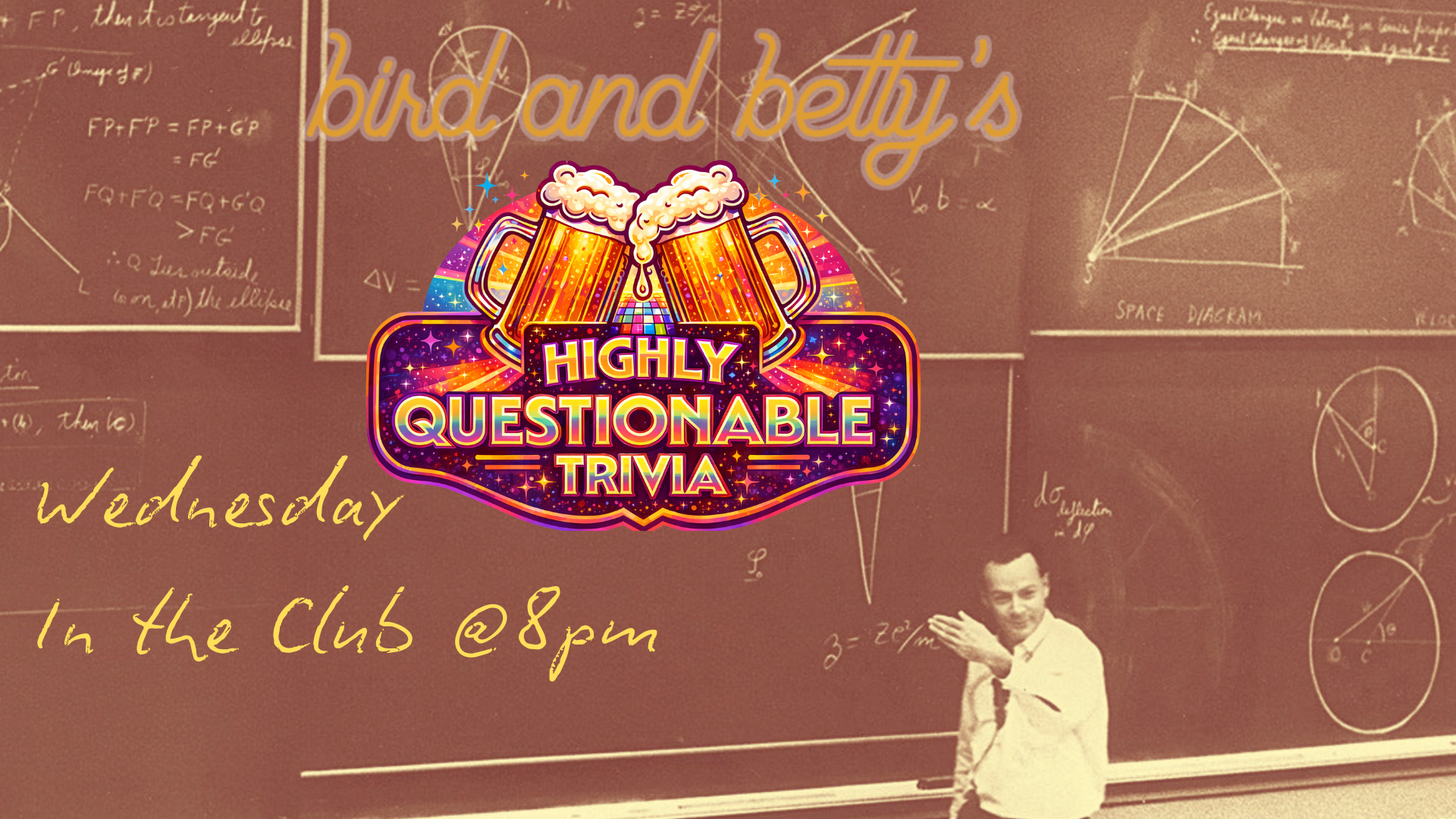 Aug 20 8:00 PM20:00 Highly Questionable Trivia Night Wednesday, August 20, 2025 8:00 PM 11:00 PM 20:00 23:00 Google Calendar ICS View Event →